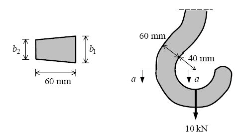 Tehtävänä on määrittää kuvan koukun suurin Von Mises -vertailujännitys leikkauksessa a-a oheisessa kuormitustapauksessa, kun b1=35mm ja b2=25mm.