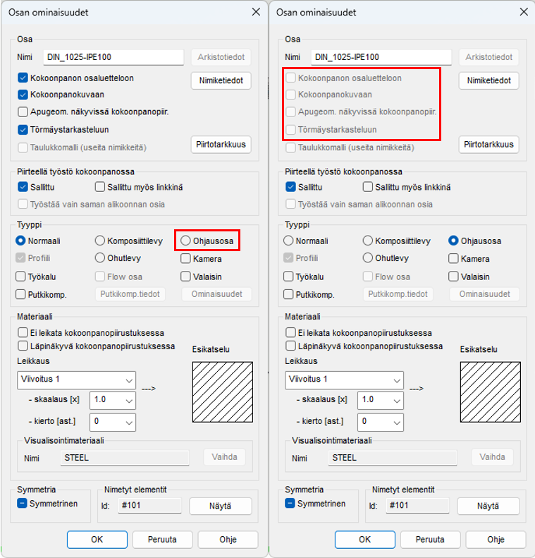 Ohjausosaksi voit määritellä minkä tahansa paikallisen osan. Osan ominaisuuksissa on valinta “Ohjausosa”. Kun olet määrittänyt osa ohjausosaksi, sen kuvake kokoonpanopuussa muuttuu mustaksi.
