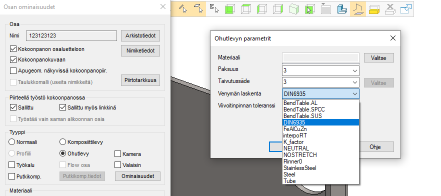 Kun haluat käyttää näitä taivutusarvoja mallissa, valitse ohutlevyn ominaisuuksista tasausarvojen laskentaan "OmatTaivutukset".