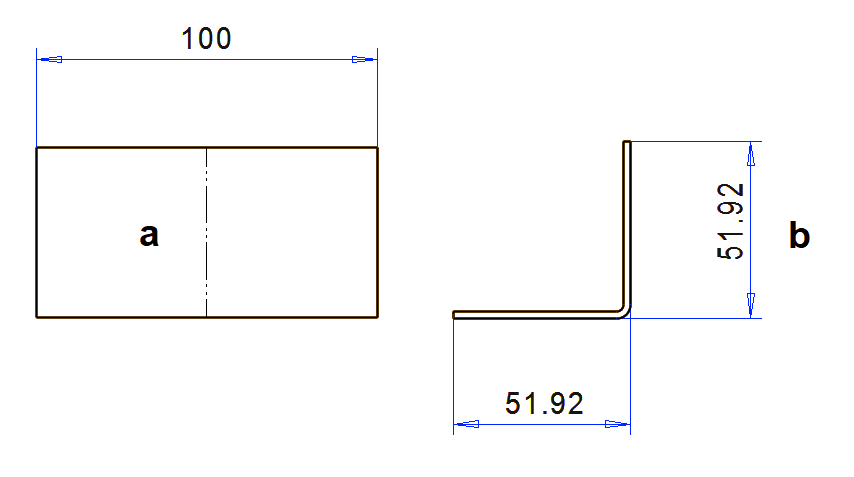 Leikkaa suora levyaihio (a), ja särmää se 90 asteen kulmaan (b). Mittaa sivujen pituudet. Laske erotus ja jaa se kahdella. Lisää materiaali ja levynvahvuus taivutustaulukkoon (esimerkissä levymateriaali on AISI304 ja paksuus 0.8mm) ja lisää laskemasi arvo 90 asteen kohdalle. Toiminnolla "Laske" saat tasausarvot muille kulmille.