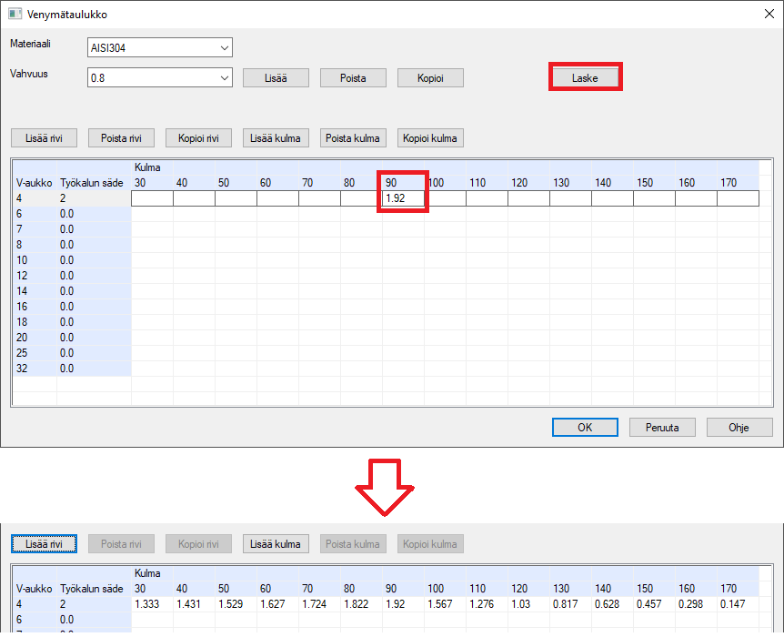 Yllä olevan esimerkin mukaan taivutustaulukkoon tulee arvo (51.92+51.92-100)/2 = 1.92.