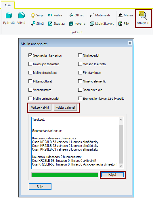 - Analyysi kertoo osan geometristen elementtien tyypit ja lukumäärät.