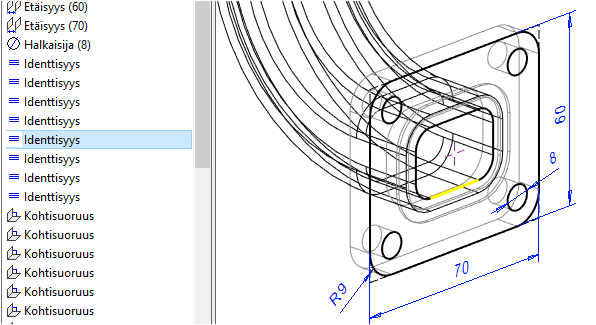 Identtisyys-ehto syntyy automaattisesti, kun jokin geometrian viiva kopioidaan luonnokseen. Viivaa ei ole tähän saakka merkitty grafiikka-ikkunassa, kun identtisyys-ehto on valittu piirrepuusta. Nyt identtisyysehdon omaava viiva saa huomiovärin, kun se valitaan piirrepuusta. Tämä auttaa helpottamaan niitä tapauksia, joissa identtisyysehto täytyy poistaa joltain tietyltä viivalta. (Vertex ID: MEC-11158).