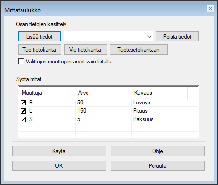 - Tilannekohtainen toiminto Mittataulukko avaa dialogin, jonne voit syöttää muutujien kuvaukset.