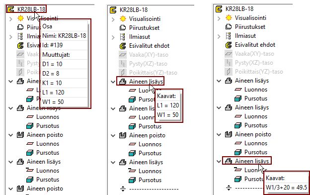 - Mallin sisältämät mittamuuttujat näet myös viemällä kohdistimen piirrepuun pääsymbolin kohdalle.