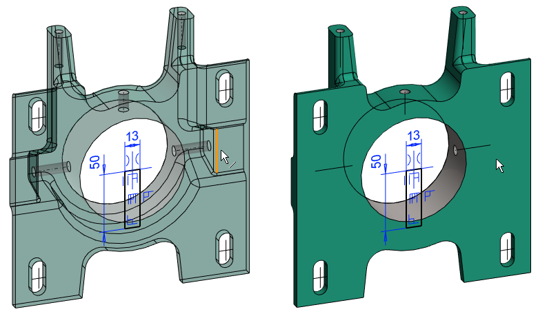 - Toiminnallisuus on käytettävissä sekä 2D-luonnoksessa, että 3D-luonnoksessa silloin kuin muokkaat osaa kokoonpanossa.