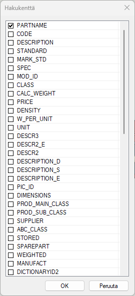 Kokoonpanopuusta haetaan osia painamalla Ctrl-F. Tämän jälkeen näet listan kenttiä, joiden sisältämiä merkkijonoja voit hakea. Alla olevassa esimerkissä on valittu osan nimi. Muut kentät ovat arkistokortin ja nimiketietojen kenttiä.