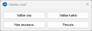 Valinnan jälkeen sinulta kysytään haettavaa merkkijonoa, ja annettuasi sen, voit valita haetko yksittäistä osaa, vai halutko valita puusta kaikki osat, jotka vastavat merkkijonoon.