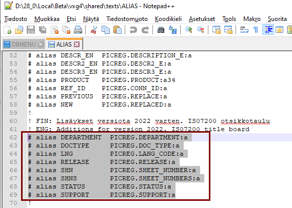 ALIAS-tiedoston määrityksiä tarvitaan, kun piirustuksen otsikkotaulun tiedot täydentyvät piirustusarkistolla olevilla tiedoilla.