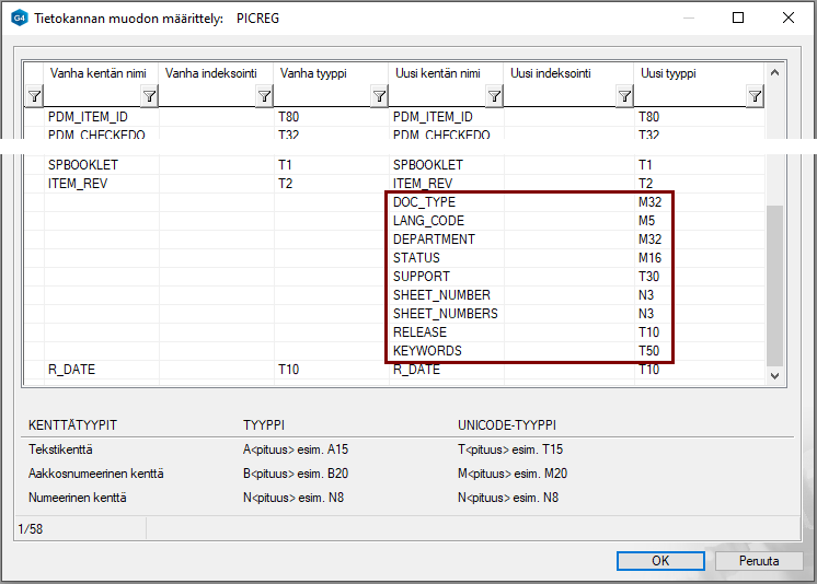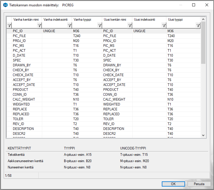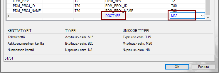- Ensimmäinen kirjan kertoo tyypin (M = Aakkosnumeerinen kenttä, T= Tekstikenttä, N= Numeerinen kenttä)