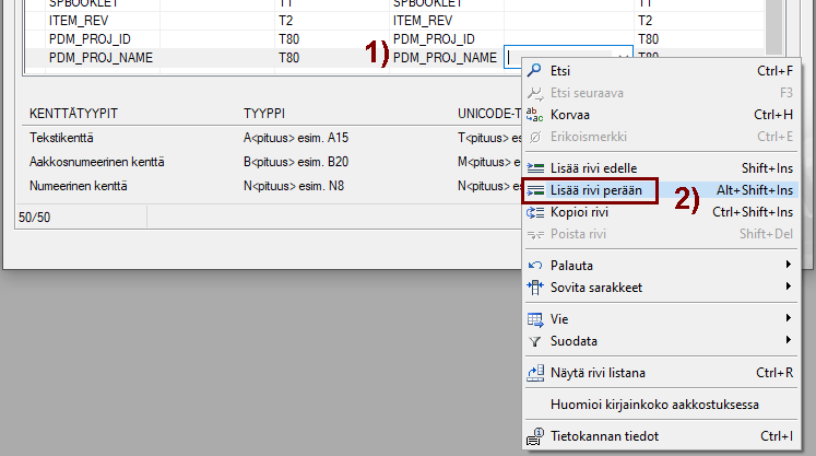 - Kirjoita sarakkeeseen Uusi tyyppi kentän typpi ja pituus
