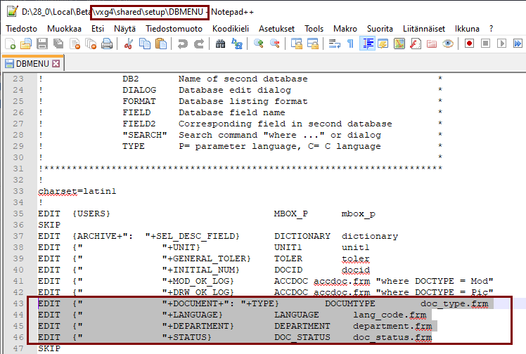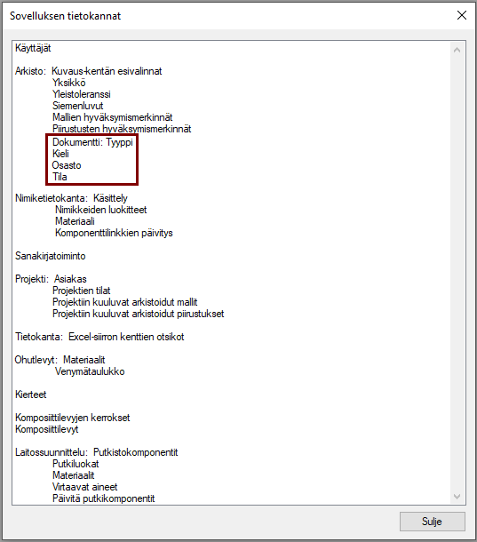 Versiosta 28.0.00 alkaen toimituspaketissa on mukana vxg4/shared/dbases-kansiossa seuraavat tietokannat: Dokumentin tyyppi, piirustuksen kielikoodi, vastuullinen osasto ja dokumentin tila.