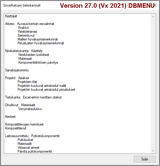 Alla vertailua varten version 27.0 (Vertex 2021) Sovelluksen-tietokannat (DBMENU) toimituksen mukainen sisältö, joka siis tarvitse täydennyksiä: