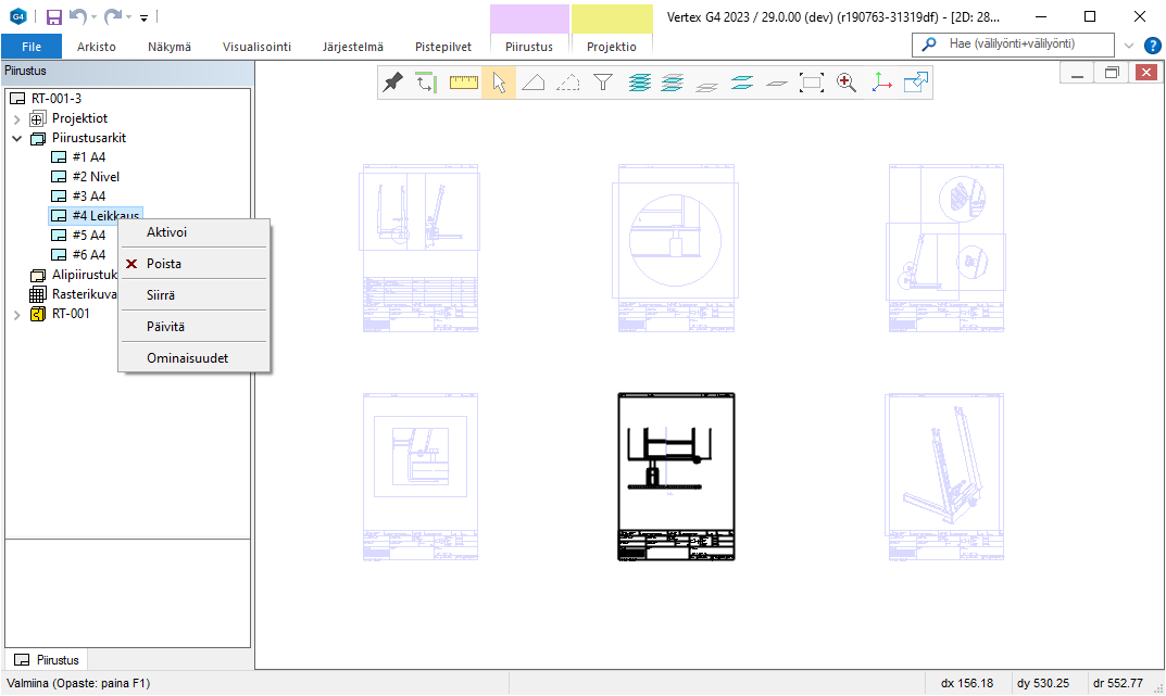 Tähän asti Vertexin 2D -piirustus on ollut yksi kuva. Asiakkailta tulleena toiveena on ollut, että suuret kuvat, joissa on paljon projektioita, voitaisiin jakaa sivuiksi tulostusta ja käsittelyä varten. Nyt tämä on toteutettu ja voit hyödyntää uusia ominaisuuksia suunnittelutyössä.