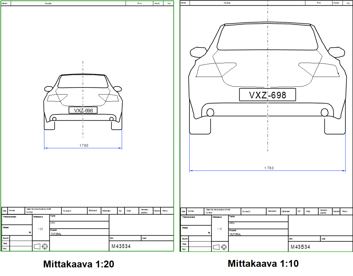 Teksti voi olla korkeudeltaan myös negatiivinen. Tällöin tekstin koko skaalautuu mittakaavan mukaan. Esimerkkinä voisi olla teksti jonka halutaan kuvaavan todellisessa geometriassa olevaa laitekipleä tai vaikkapa laitteen nimeä. Alla olevassa kuvassa on havainnnollistettu kaksi eri tekstikorkeutta: mittaluku 1760 on korkeudeltaan 3.5, joten se on piirustuksessa aina saman kokoinen. Rekisterikilven tekstin taas on seurattava kilven kokoa, jolloin se pienenee tai suurenee mittakaavan mukaan. Esimerkissä tekstin korkeus on 90 mm, jolloin sen korkeudeksi on annettu -90.