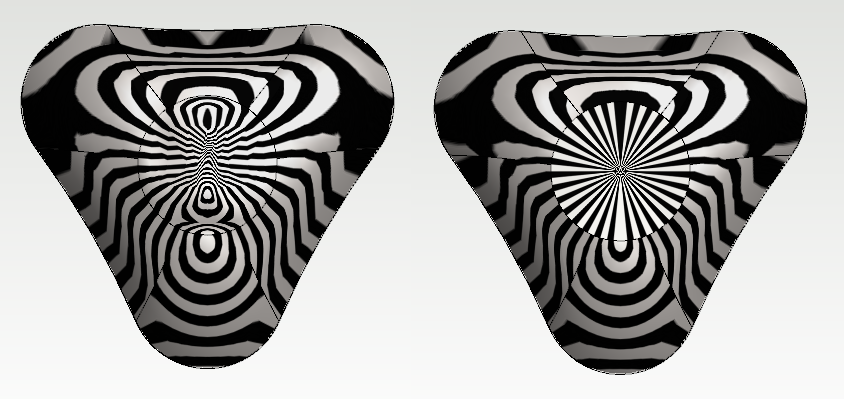• Vasemmalla olevan kappaleen yläpinta on tangentiaalinen viereisille pinnoilla (Pintojen reunojen yli juohevasti jatkuva seepra-kuviointi todentaa asian).