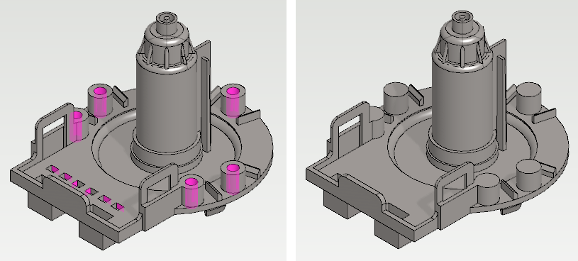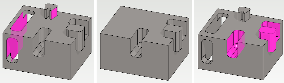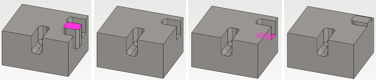 • Toiminto ei poista piirteitä, jotka muodostavat ikään kuin kappaleen ulkopinnan siten että ne rajoittuva kahteen vierekkäiseen pintaan. Tämän takia esim. pyöristyksiä ei voi poistaa tällä toiminnolla.