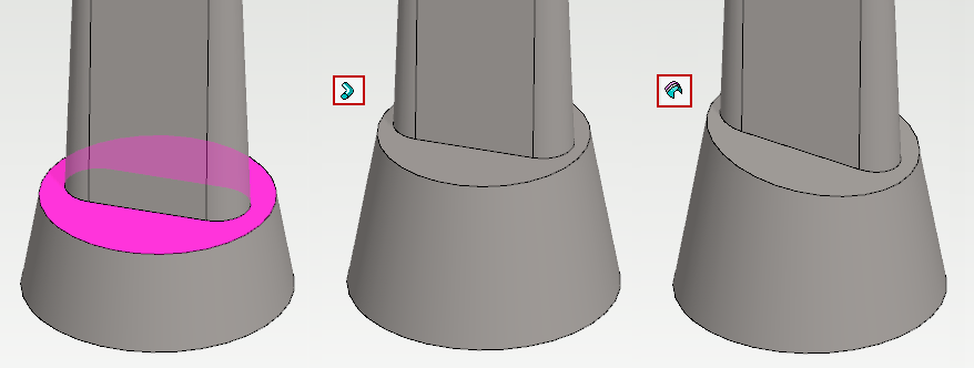 • Oikealla pintaa on siirretty. Pinnan siirrolla päästäisi tässä tapauksessa myös samaan lopputulokseen kuin jatkamisella, mutta sen lisäksi pintaa voidaan kallistaa.