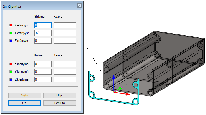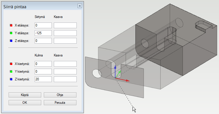 • Huomaa, että kohdistimen mukana liukuva pinta kuvaa lähtöpintaa haluttuun kulmaan käännettynä, eikä siten vastaa kappaleeseen muodostuvaa pintaa. Käytä-painikkeen avulla näet kappaleen oikean muodon,