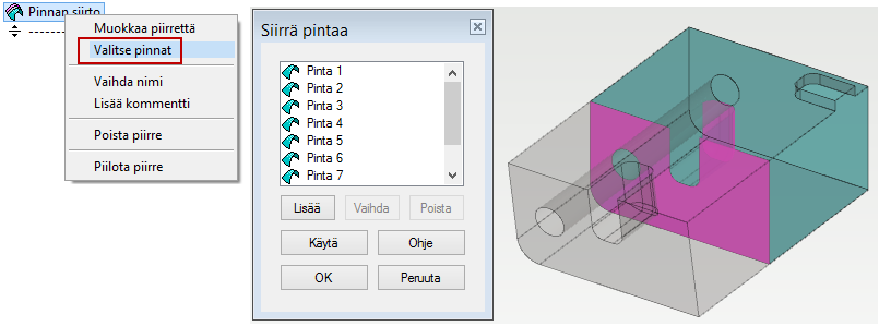 Jos haluat vaikuttaa valittuihin pintoihin, niin valitse piirre historiapuusta ja tilannekohtaisesta valikosta toiminto: Valitse pinnat.