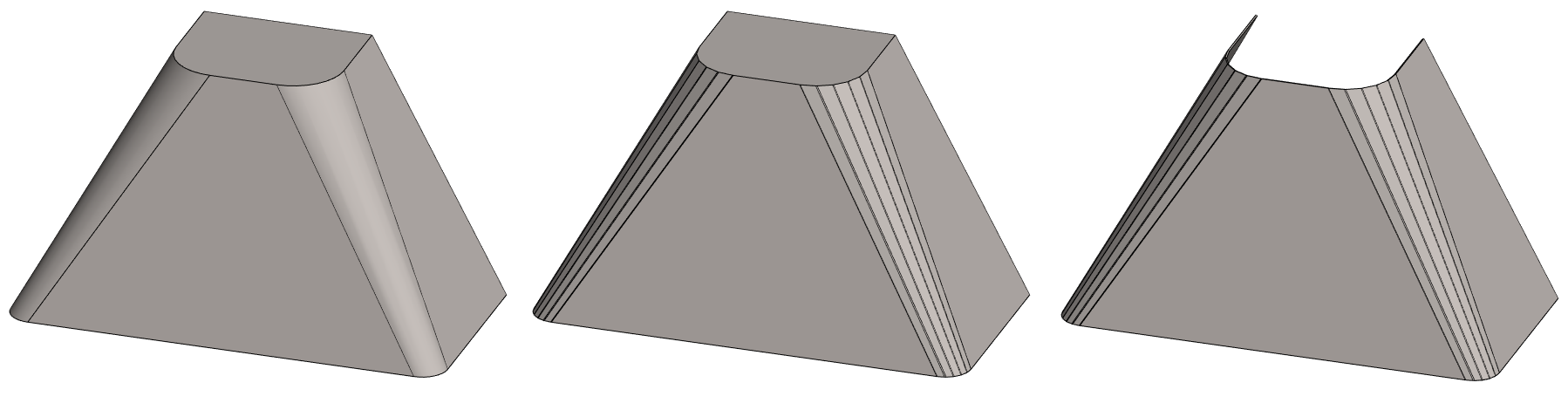 • Keskellä: Spline-pinnoille on tehty Pinnan särmäys, joka on löytyy Levyrakennesuunnittelu-option työkaluista.