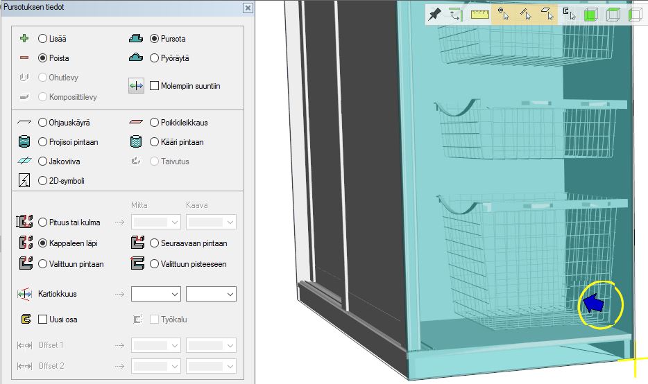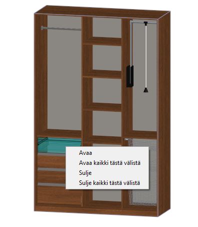 Erilaiset komponentit: korit, laatikot,... voidaan nyt avata ulos kalusteesta toimivuustarkastelua varten. Avaus/sulkeminen voidaan tehdä yhdelle komponentille kerrallaan tai kaikille komponenteille yhdessä asennusvälissä.