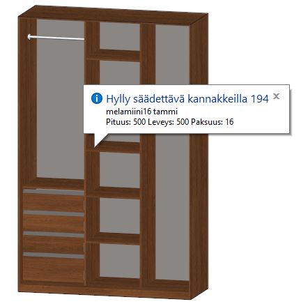 Saat nyt kalusteen osista infotekstin kursorin viereen, kun asetuksissa on valittu "Näytä geometriavihje kohdistimessa". Infotietoina kerrotaan: Osan nimi, materiaali ja väri sekä mittatiedot.
