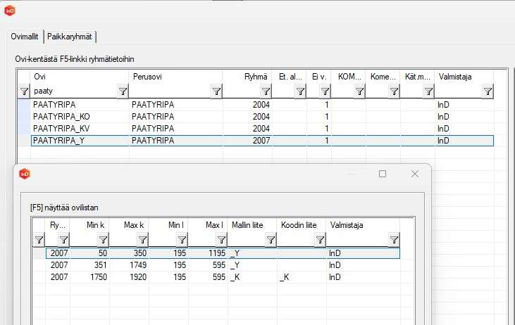 Korjaa lisäksi Ovien ryhmämääritystietokannassa PAATYRIPA-oven määritykset kuvan mukaisiksi