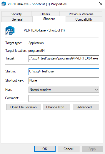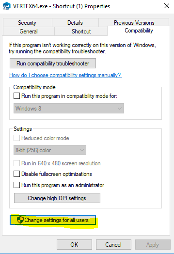 Tee työpöydälle uusi pikakuvake VERTEX64.EXE:lle. Käynnistyskuvake pitää tehdä käsin, koska Compatibility asetusta ei ole mahdollista muokata .bat –käynnistysskriptissä.