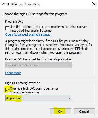 Laita päälle valinta High DPI scaling override: