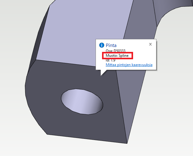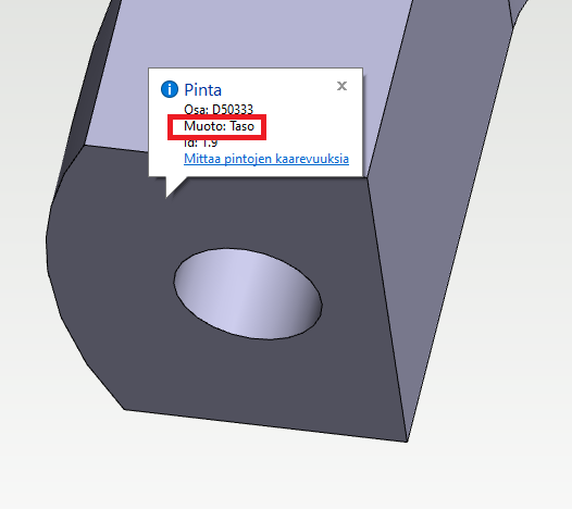 Pinnan muodon voi tarkistaa osan muokkaustilassa siirtämällä kohdistin pinnan päälle: