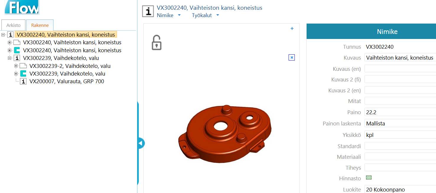 Kokoonpanon rakenne noudattaa samaa periaatetta kuin kuvassa esitetty työvaiheistus osan valmistuksessa. Valmis osa on oma nimikkeensä mutta myös puolivalmiste-valu voi olla oma nimikkeensä jos se toimitetaan varastoon etukäteen.