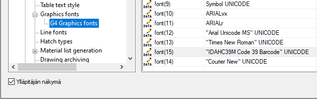 Tämän jälkeen voit lisätä viivakooditekstiä Vertex G4 piirustukseen valitsemalla tämän fontin.