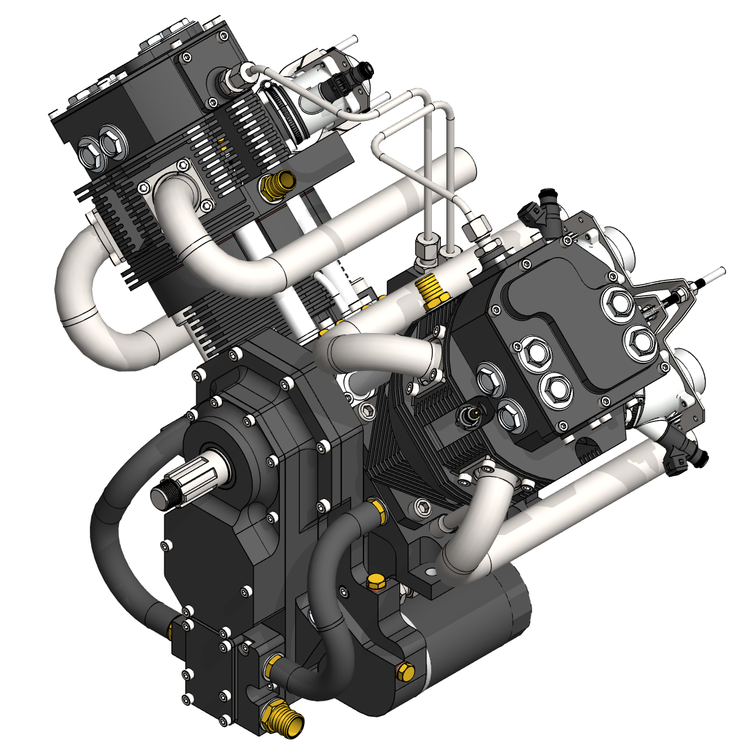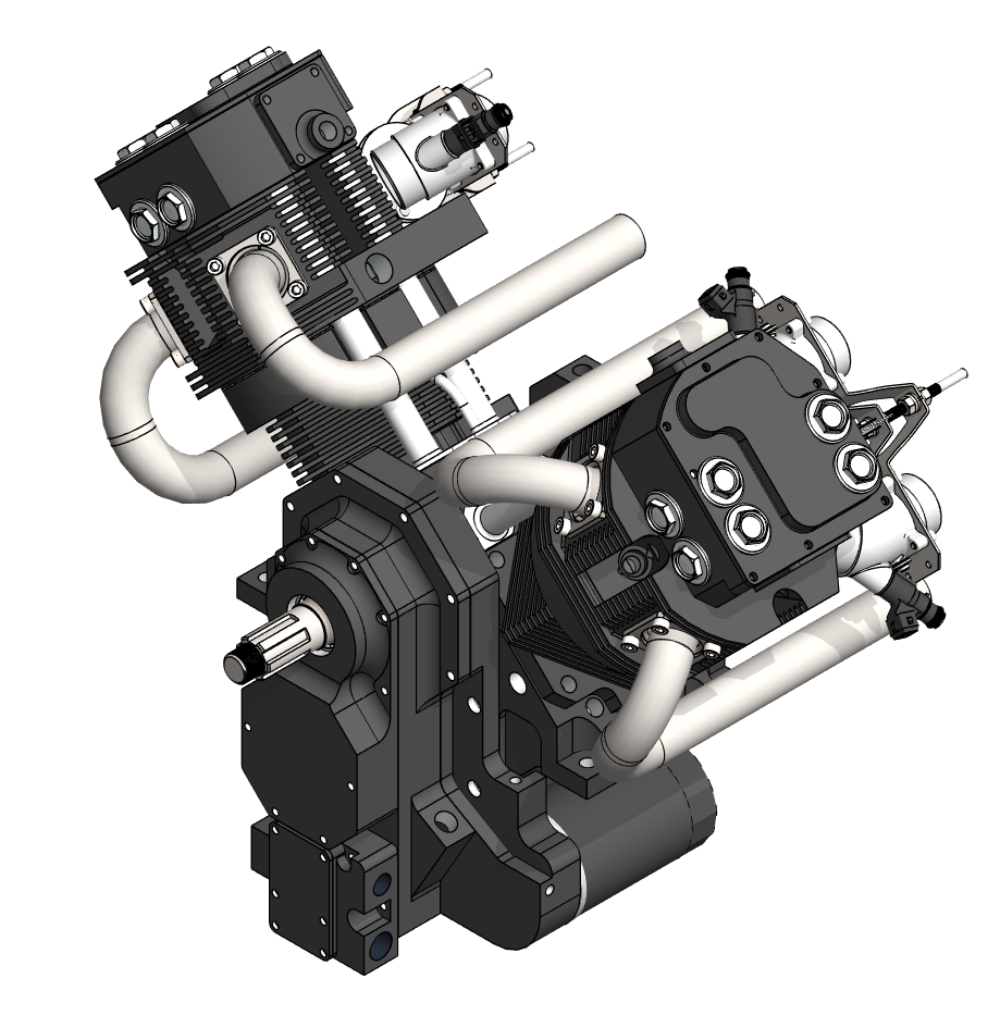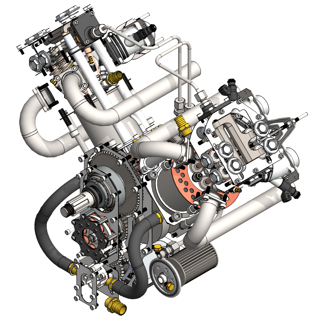Esimerkissä on V2-polttomoottorin 3d-malli, jonka ulkopuolisten osien lisäksi malli sisältää todella paljon mallin sisäpuolella olevia osia.