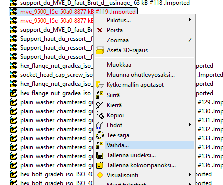 Kokoonpanossa mallin päällä piirrepuussa hiiren oikea näppäin ja "Vaihda"