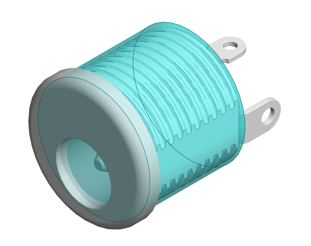 Oheisessa kuvassa on virtaliittimeen lisätty paikallinen osa (jigi, skeleton tms.), johon on mallinnettu lieriö. Kokoonpanossa tämän geometria voi piiloittaa ilmiasussa ehtejen annon jälkeen.