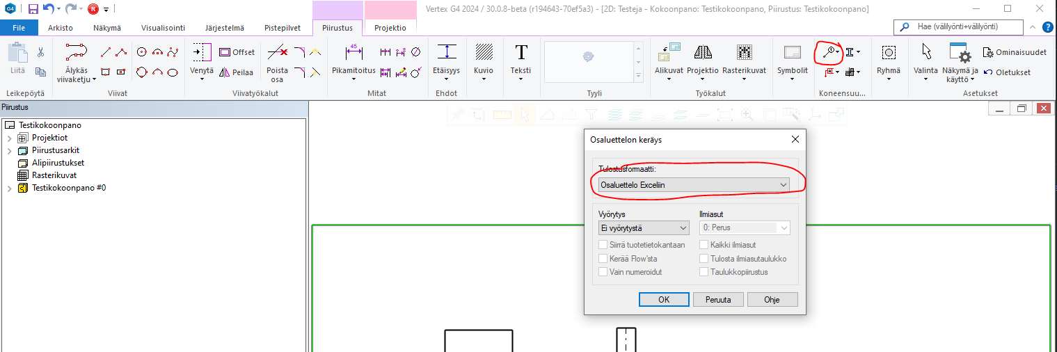 Vertex G4:ssä onnistuu vakiona suoraan katkaisulistamuodossa olevien osien (profiilien) painojen ajaminen suoraan excel-listaan, mutta ei normaalissa osaluettelomuodossa.