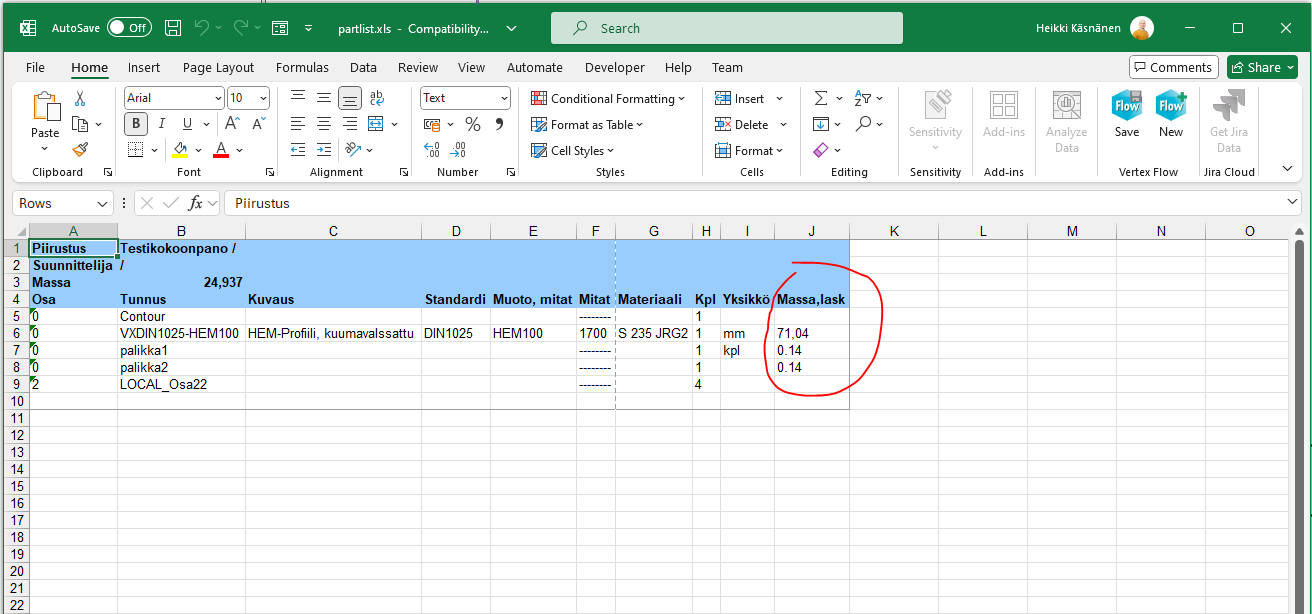 Tämän jälkeen piirustuksessa Osaluettelo → Osaluettelo → Osaluettelo Exceliin -toiminto tulostaa rivin viimeiseksi tiedoksi myös massan.
