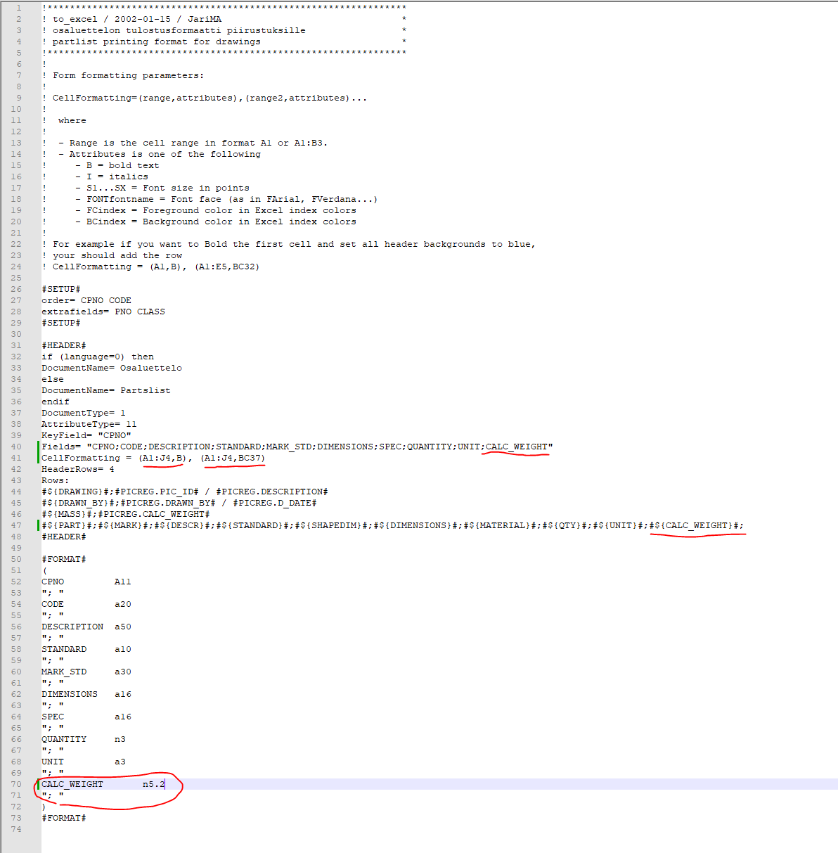 Lisää CALC_WEIGHT-kentät riveille 40, 47 ja 70.