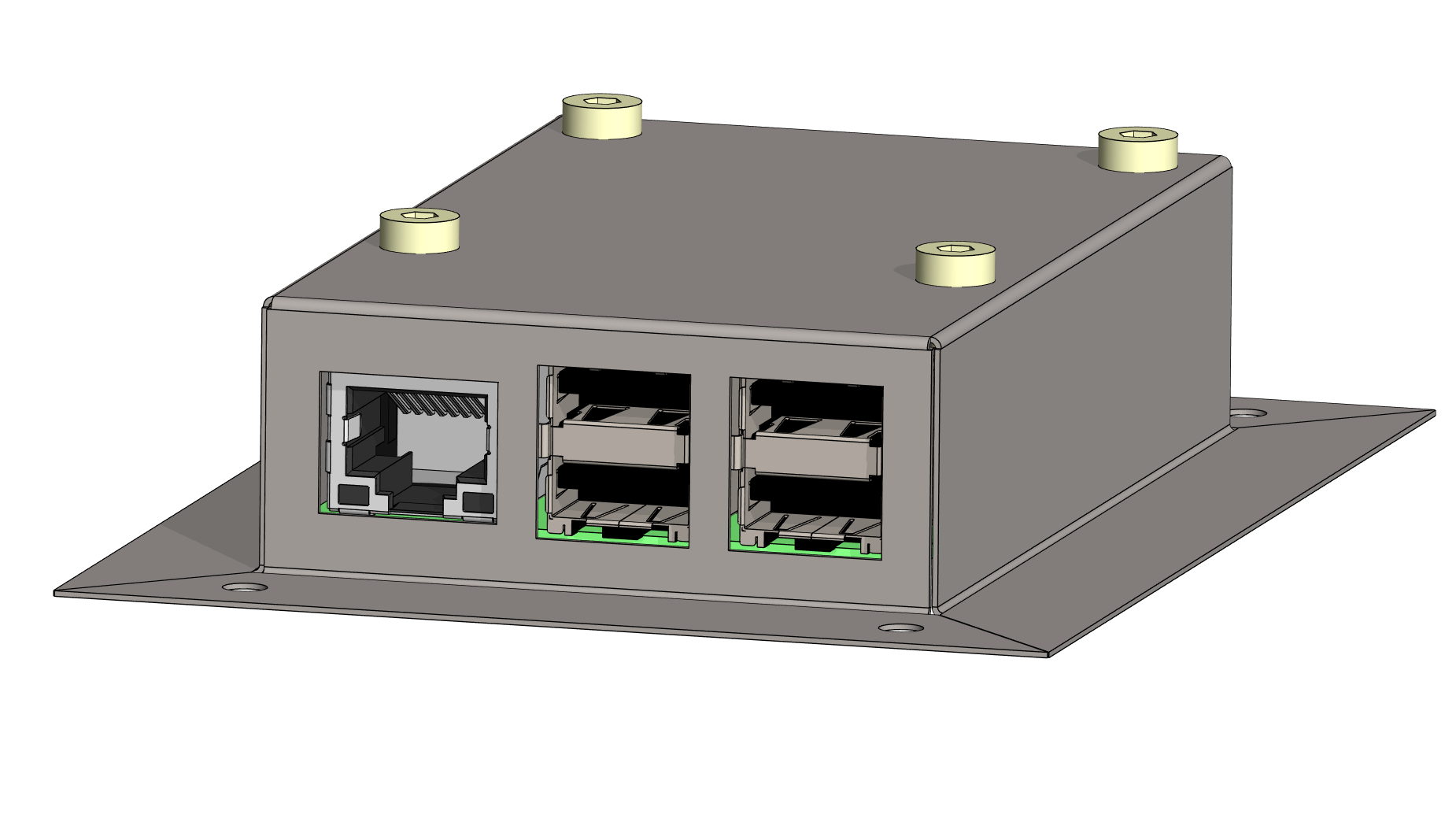 Vertex G4:ssä voit rakentaa esim. kotelorakenteita piirilevyn ympärille. Esimerkissä Raspberry Pi-kortille G4:n puolella suunniteltu ohutlevykotelo, jossa rei'itys ja piirilevyn kiinnitys sekä kotelon kiinnitys suunniteltu.