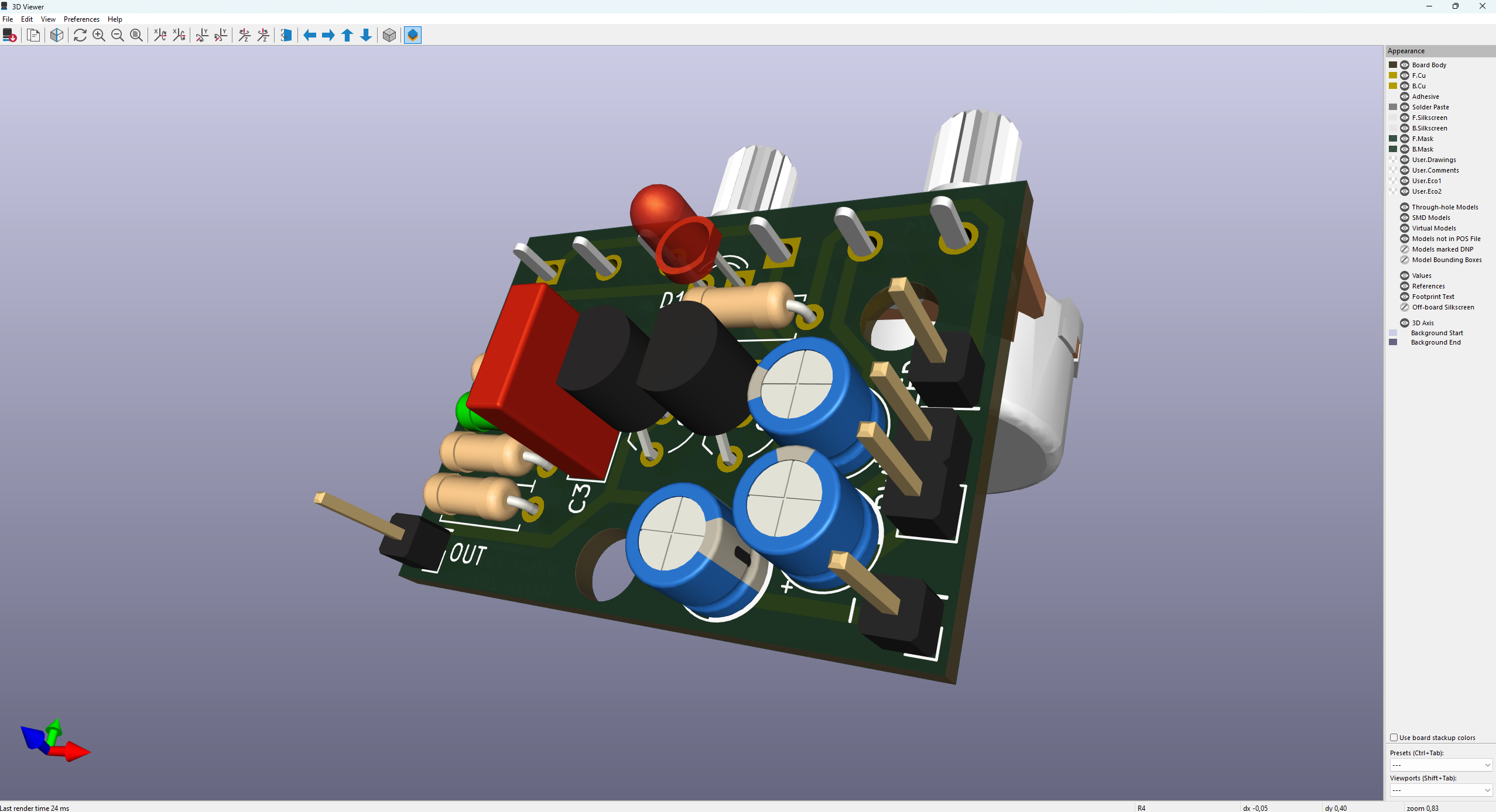Mikäli komponenttien symboleihin on liitetty 3d-mallit, näkyvät ne myös 3d-esikatselussa
