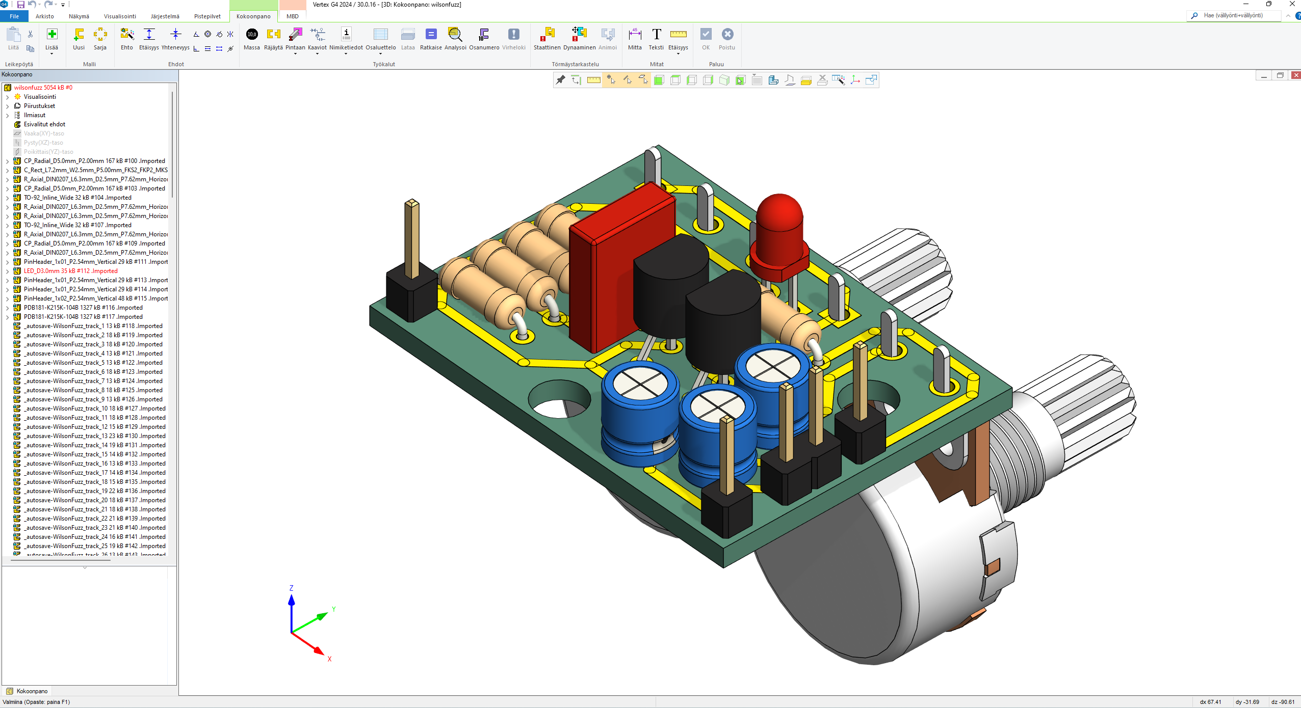 Esimerkin piirilevy komponenttien kera avattuna Vertex G4:ssä. Malli tulee kokoonpanona sisään, jonka jälkeen kaikkia komponentteja voidaan muokata (poistaa ja piilottaa).
