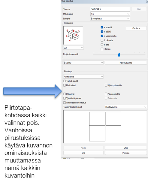 Piirustusten projektioiden piirtotapavalinnat, tarkat siluetit jne.