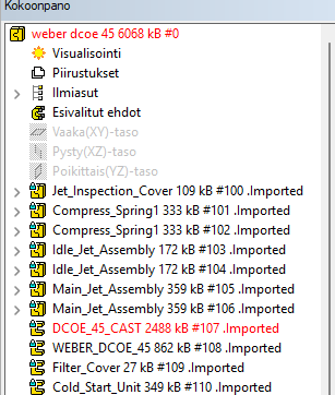 Kun tuotu 3d-malli on kokoonpanomuodossa, näkyvät alirakenteet mallin kokoonpanorakenteessa.