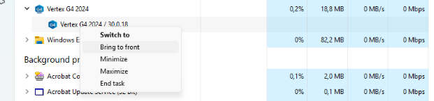 Ratkaisuna Task managerista Vertexin saat kuitenkin aktivoitua "Bring To Front" toiminnoilla.