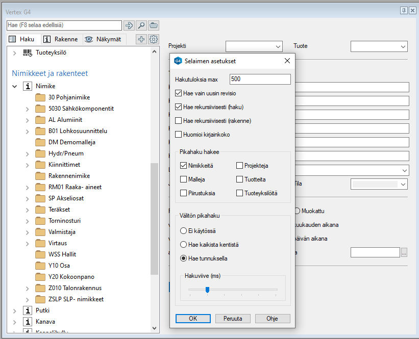 Kokeile, auttaako haun asetusten muuttaminen ongelmaasi. Esimerkiksi valinta "hae kaikista kentistä" on hitaampi kuin "hae tunnuksella". Välittömän pikahaun (eli esikatselun) voi ottaa myös kokonaan pois käytöstä. Jos välittömän pikahaun ottaa pois, niin silloin hakukenttään kirjoitetaan haluttu merkkijono, ja haku lähtee päälle vasta enterin/hakunapin painamisen jälkeen.