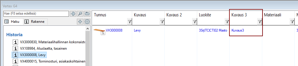 Tässä esimerkissä nimikkeelle on tehty uusi kenttä C_DESCR3. Uuden kentän perustaminen löytyy kb.vertex.fi ohjeesta.