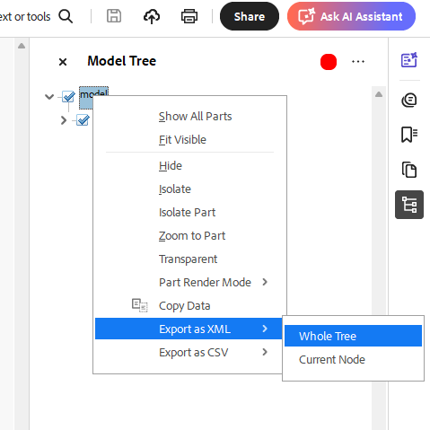 Käyttäjä voi avata tiedoston katseluun 3d pdf-tiedoston dokumenttinimikkeen puolelta sillmälasi-ikoni klikkaamalla