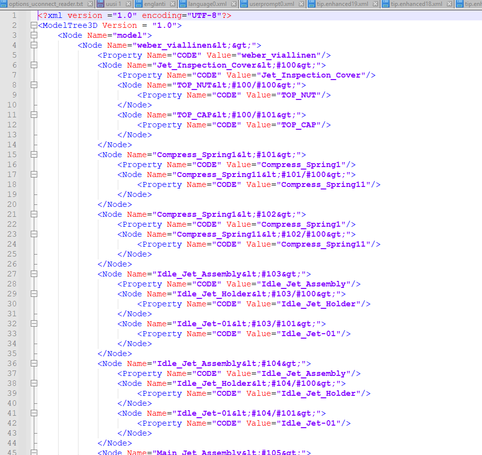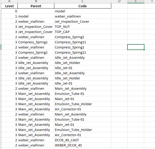 Level-kohdassa on mallin hierarkia kokoonpanorakenteessa, Parent-kohdassa alikokoonpano ja Code-kohdassa itse osan tai alikokoonpanon nimi