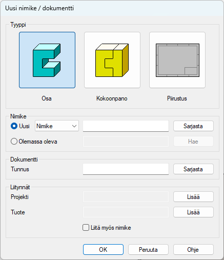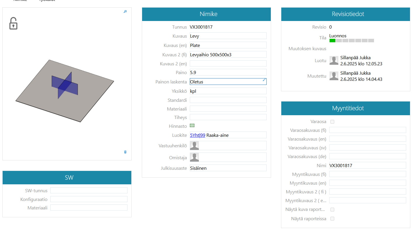 Mallinnetaan materiaalinimikkeellä varustettu suora levyaihio-osa, määritellään mateiaalinimike, perustetaan piirustus ja palautetaan nimike